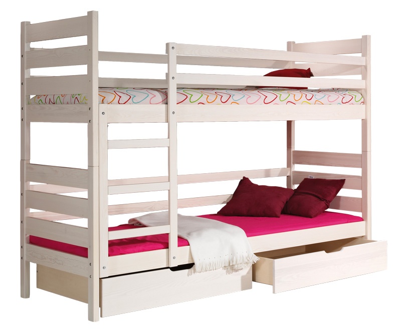 Łóżko DAREK wykonane z naturalnego drewna sosnowego , dostępne w kolorach: - sosna naturalna, - sosna barwiona na olchę, - sosna barwiona na biel, - sosna barwiona na orzech, Powierzchnia spania wynosi : -górny materac 190 cm x 80 -dolny materac 190 cm x 80 Możliwość zamówienia materaców: Materac dolny i górny ( wymiar 190 cm x 80 x 8cm lub 12 cm) - pianka 8 cm - pianka +lateks 8 cm - pianka + kokos 8 cm - bonell 12 cm - minibonell jednostronny + lateks 12 cm - minibonell jednostronny + kokos 12 cm Cena obejmuje łóżko z szufladami . Możliwość zamocowania drabinki przy dowolnie wybranym narożniku. Cena nie obejmuje dodatkowych elementów widocznych na zdjęciu. Istnieje możliwość dokupienia dodatkowych mebli z kolekcji JANEK