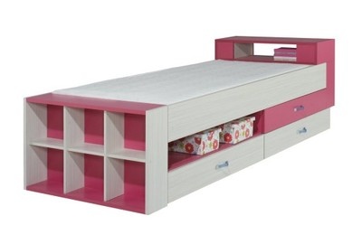 - łóżko w dekorze: jesion komi / blue oraz pink,