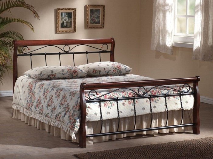 Wygodne, eleganckie i funkcjonalne meble do sypialni. Pozwalają na stworzenie sypialni marzeń i dla rozważnych i dla romantycznych. Łóżko jest wykonane z drewna i metalu w kolorze czereśnia antyczna/czarnym.
