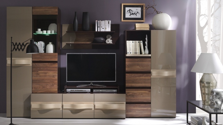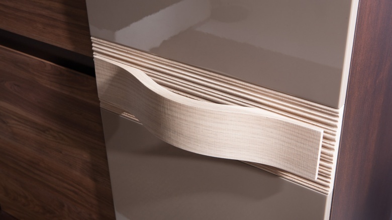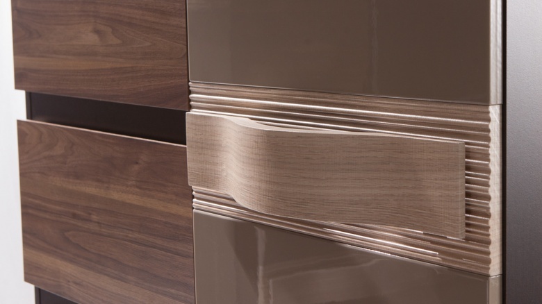 System Obsession charakteryzuje się modnym połączeniem kolorów oraz ciekawymi uchwytami. Boki mebli wykonane z płyty w kolorze Sosna lareto, fronty zaś wykonane z płyty saleve oraz połyskowej w kolorze cappucino. Dopełnieniem są uchwyty w kolorze dąb jasny.