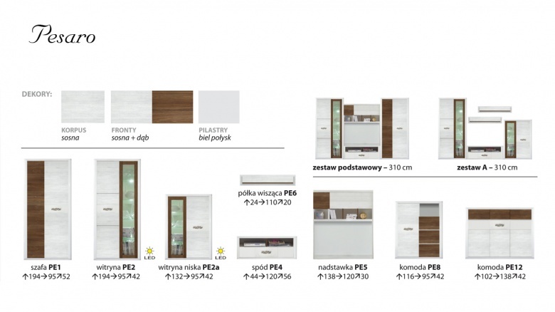Przedmiotem oferty jest nowoczesna i unikalna meblościanka z systemu Pesaro. System mebli pokojowych Pesaro kierowany jest przede wszystkim do miłośników piękna i komfortu. Spokojna, stonowana kolorystyka dębu, sosny i bieli, prostota brył, eleganckie wykończenie, solidne wykonanie to tylko niektóre zalety tej kolekcji. Największym atutem jest z pewnością niespotykany styl i wzornictwo tych mebli. Kolekcja pozawala na aranżowanie wielu wnętrz, w zależności od potrzeb klienta, każdy mebel dostępny jest także jako oddzielny element. Warto zwrócić uwagę również na trwałe wykonanie z wykorzystaniem materiałów dobrych gatunkowo