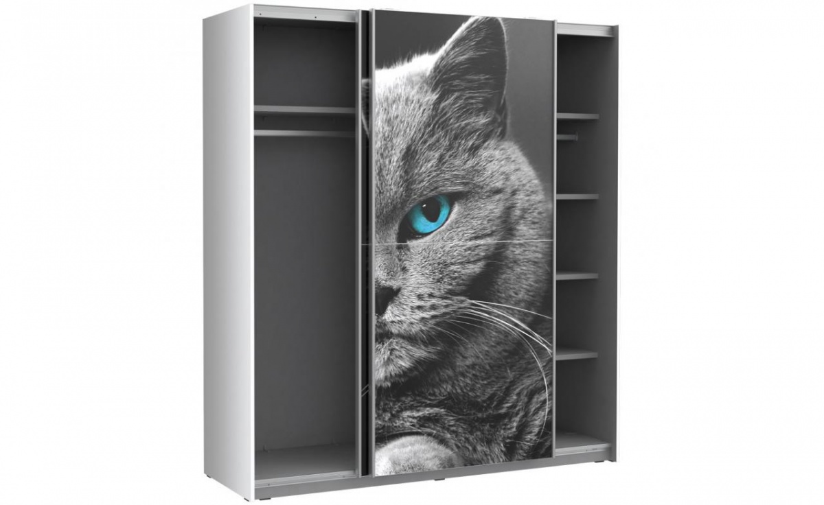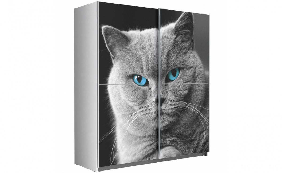 Zdjęcie kota nadrukowane na szklanym froncie będzie ciekawą inspiracją do stworzenia oryginalnej sypialni.