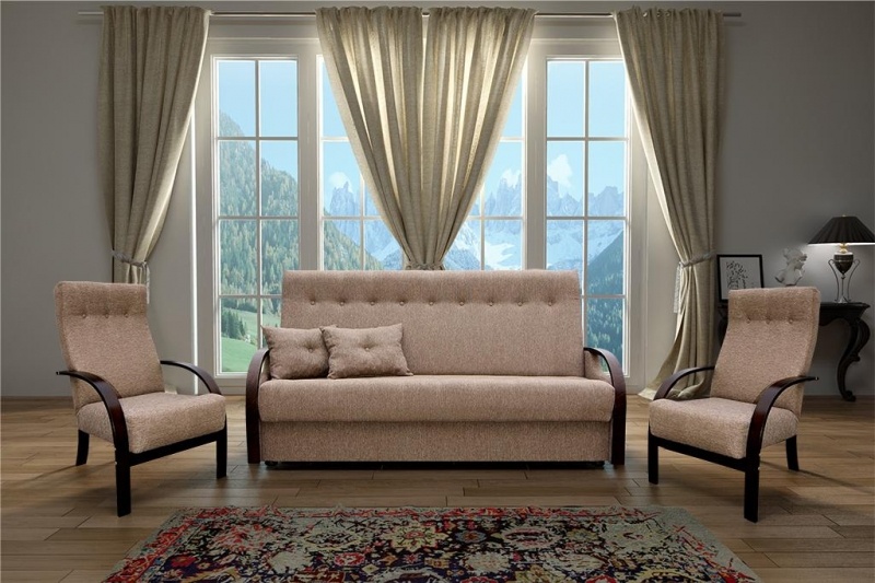 Komfortowy zestaw wypoczynkowy składający się z wersalki oraz dwóch foteli.